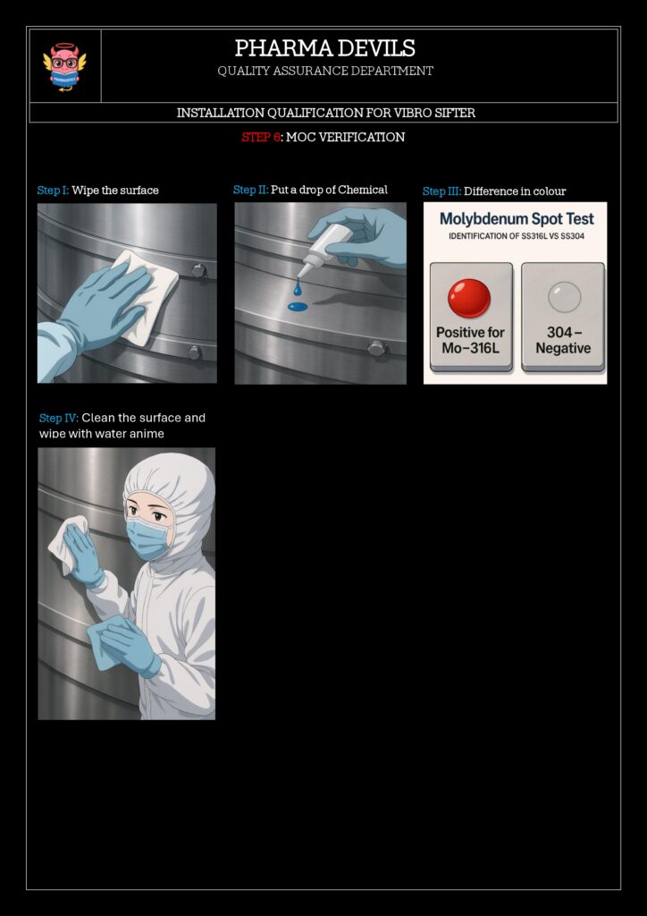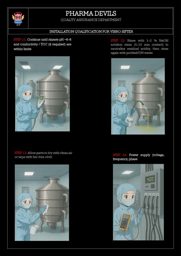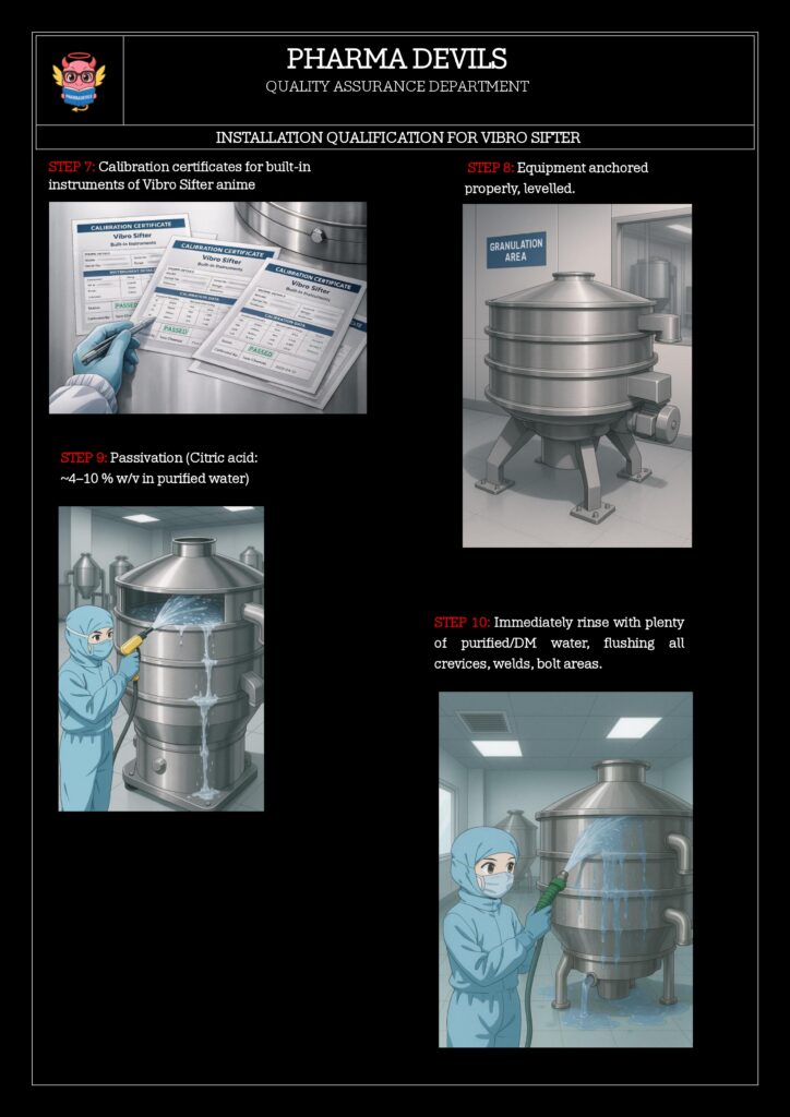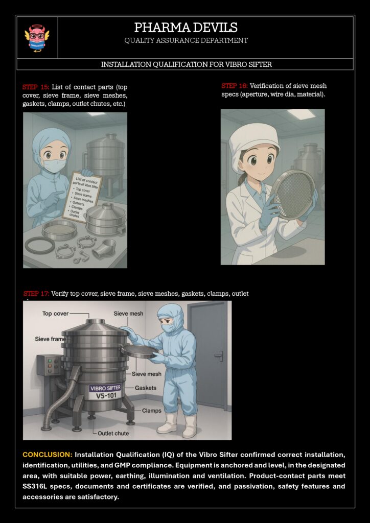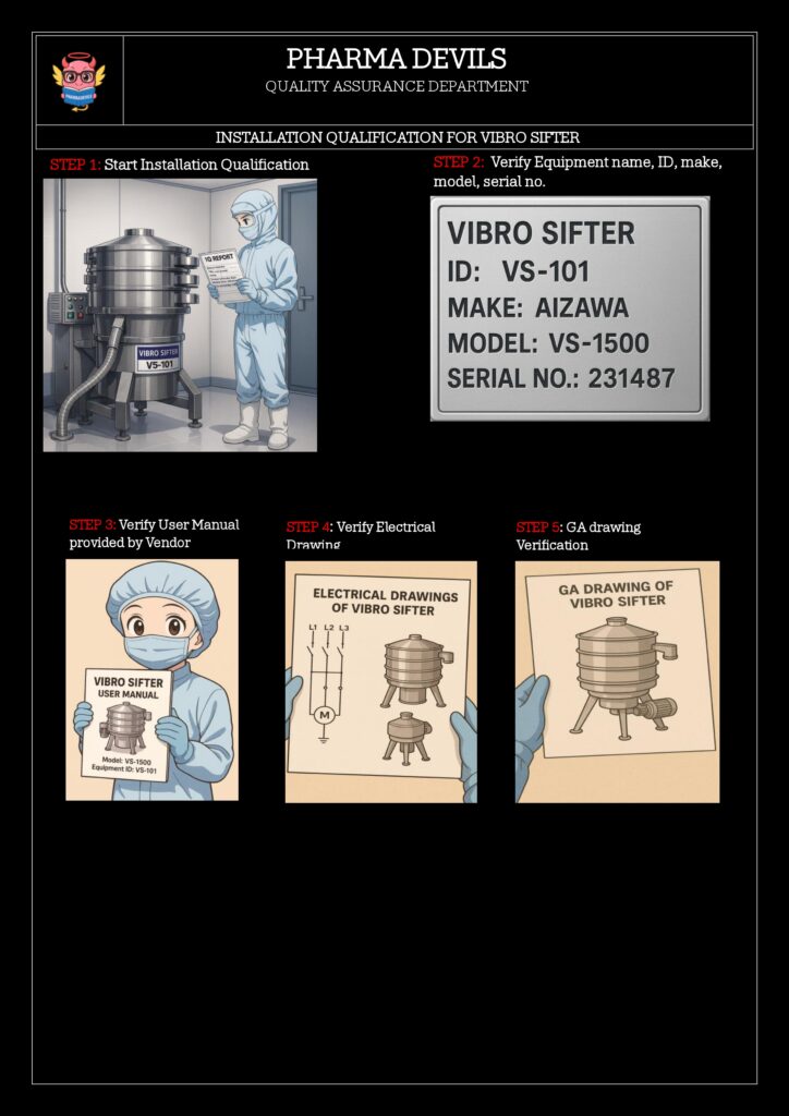 The objective of this Installation Qualification (IQ) is to verify and document that the 48″ Vibro Sifter (ID: VSF-048-01) has been received and installed as per approved specifications, drawings and manufacturer’s recommendations, and that all required utilities, materials of construction, safety and GMP requirements are in place prior to Operational Qualification (OQ).