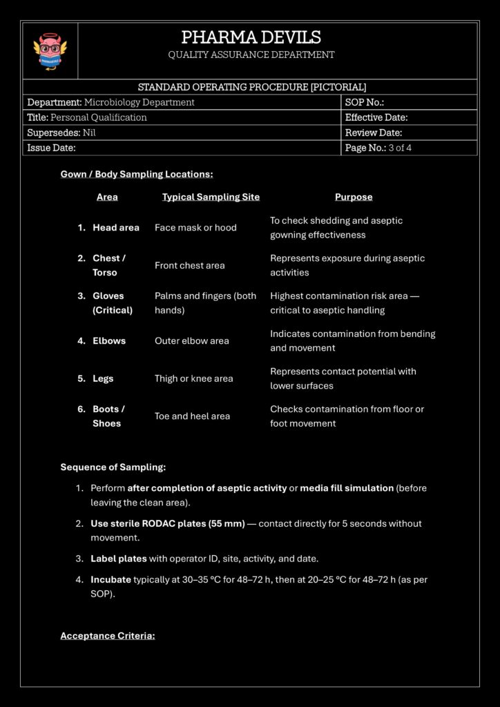 The objective of this report is to summarize the execution and results of aseptic personnel qualification in pharma performed using the RODAC (contact) plate method, and to conclude whether the candidate meets the predefined acceptance criteria for working in the aseptic area (Grade B/A).